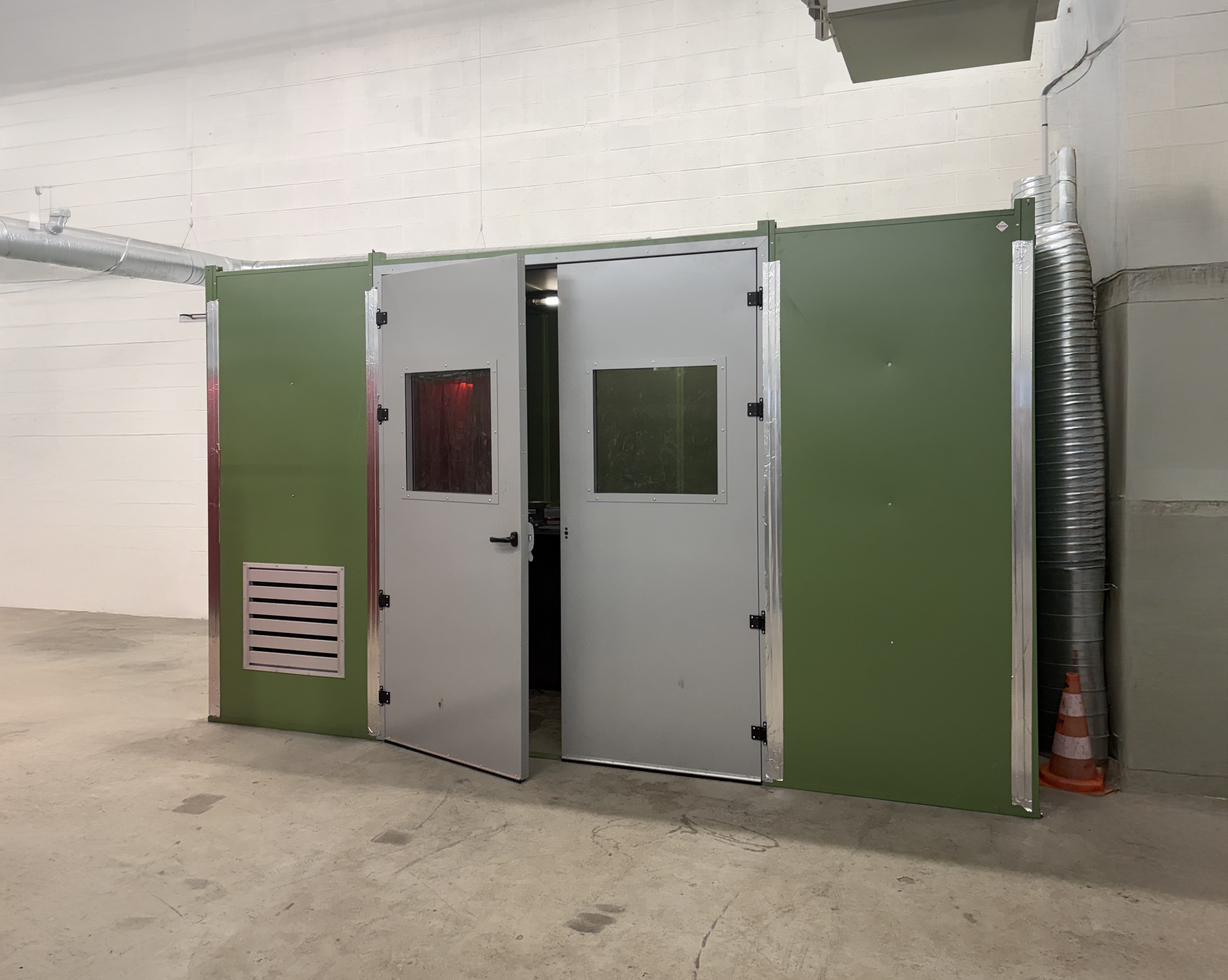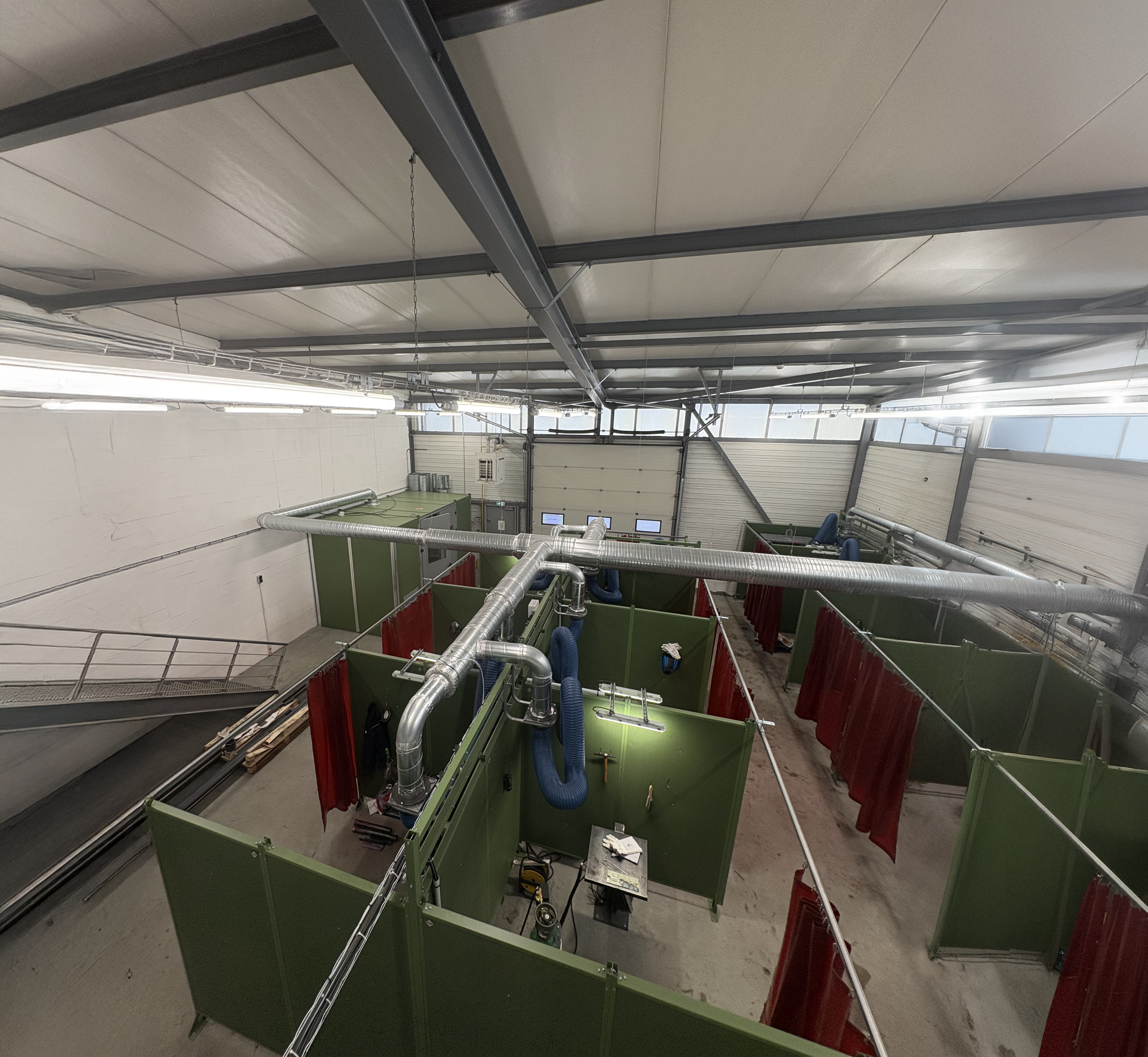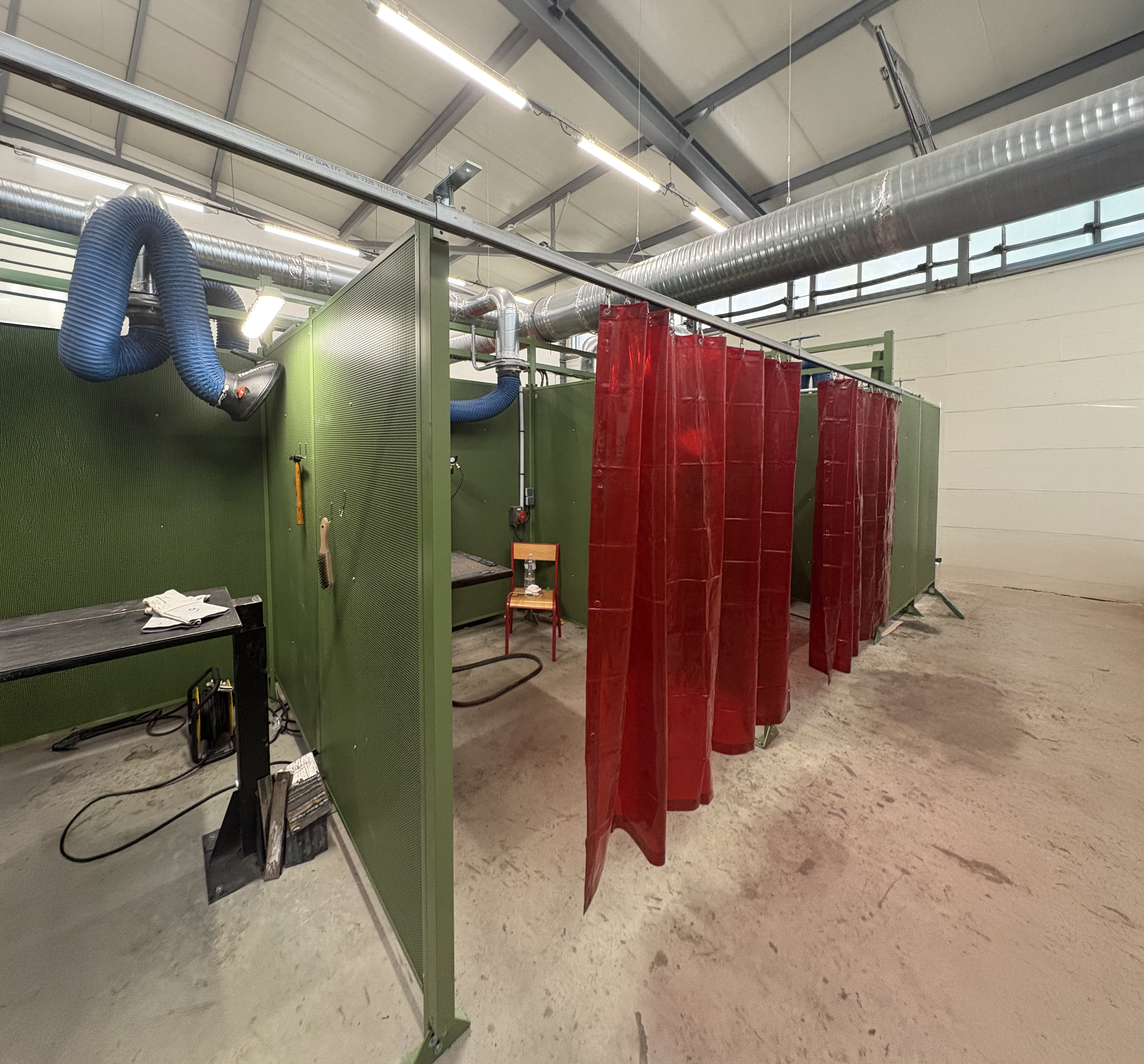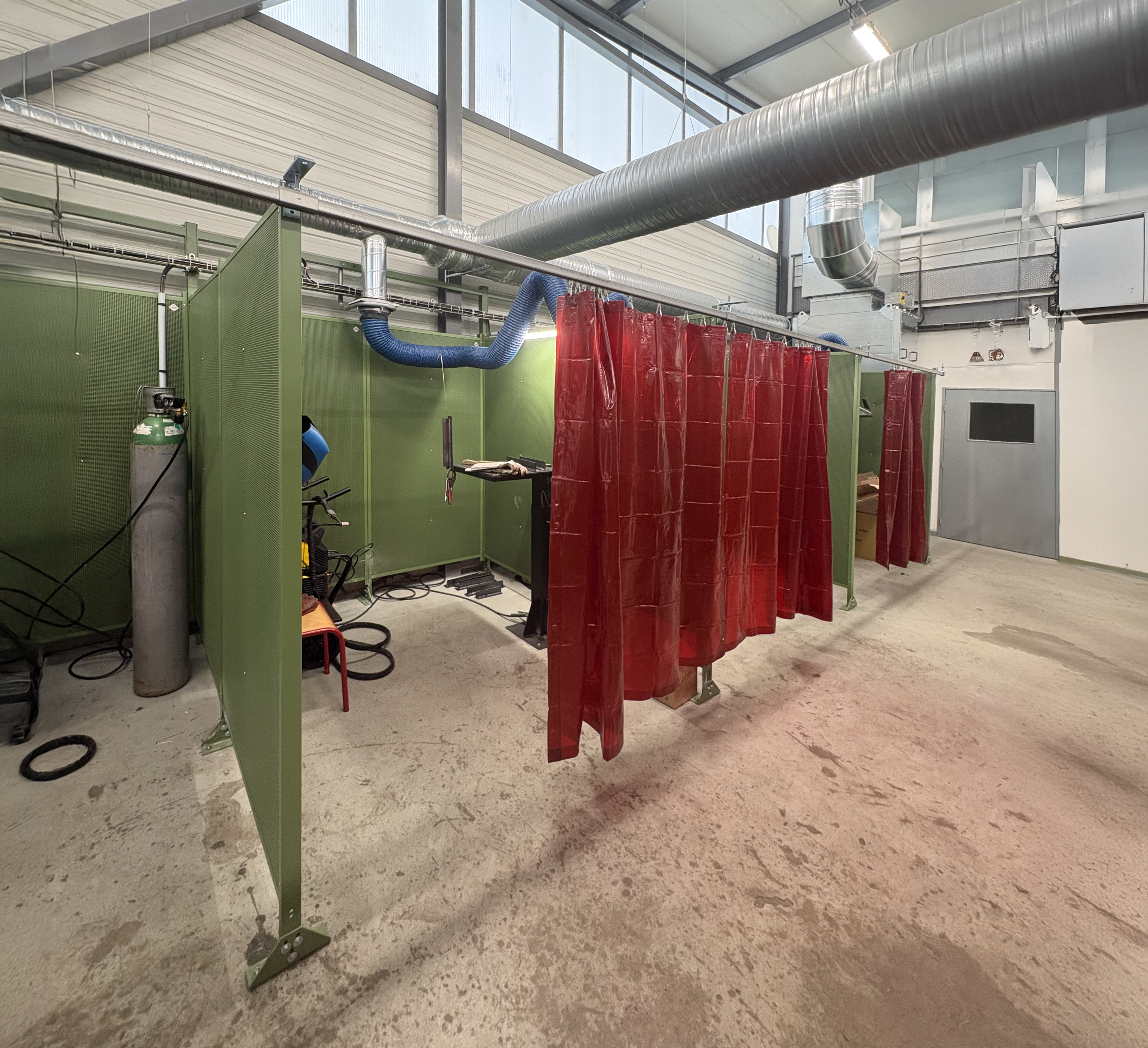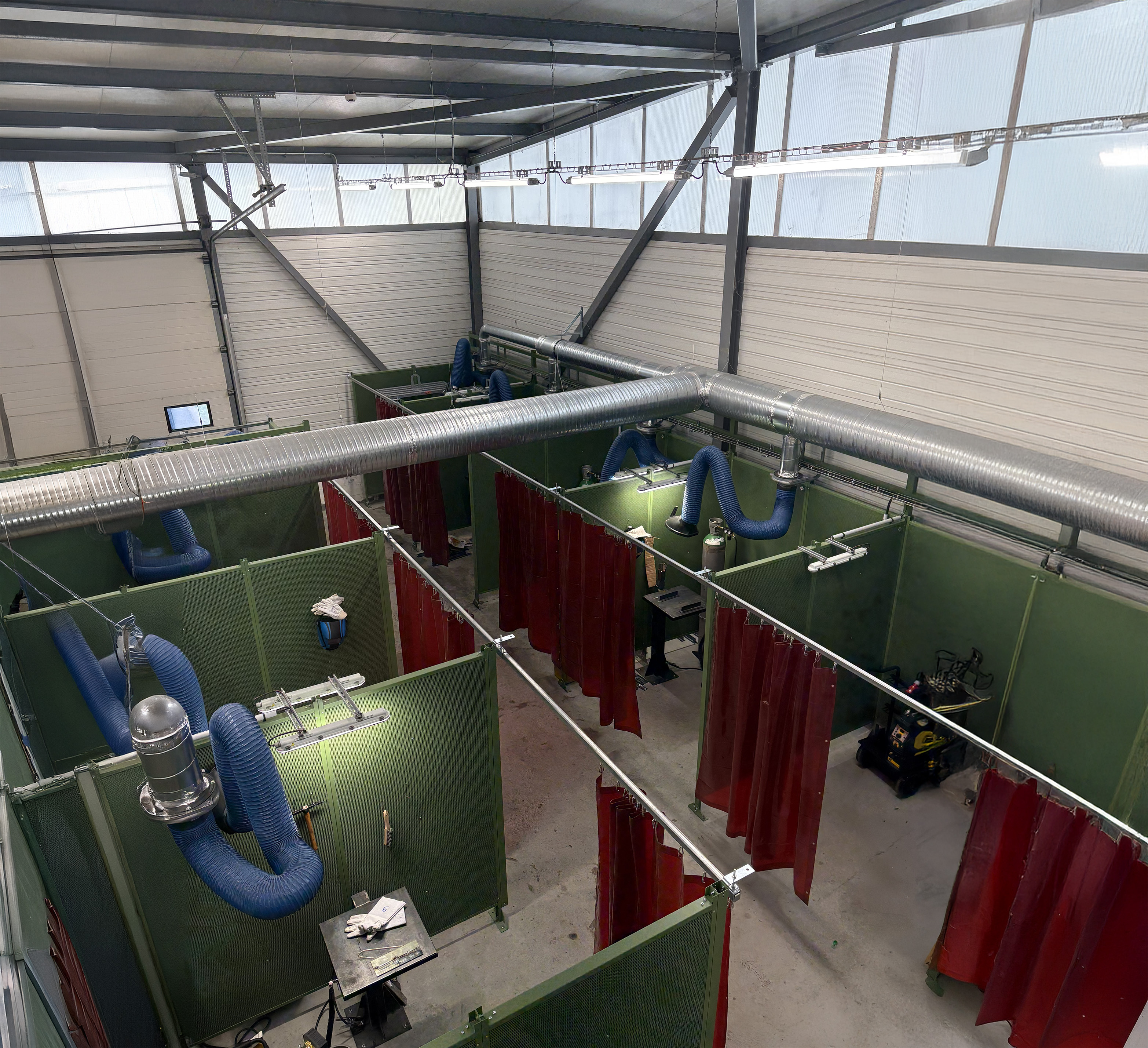 L’établissement souhaitait développer son atelier avec 12 postes de soudage complets et une cabine de meulage séparée. Outre la protection contre les rayonnements lumineux et les projections, un système d’extraction performant était indispensable pour assurer un environnement sain. L’investissement devait également rester indépendant du bâtiment actuel, en raison du déménagement prévu.